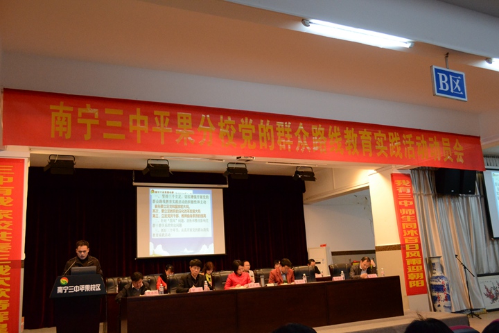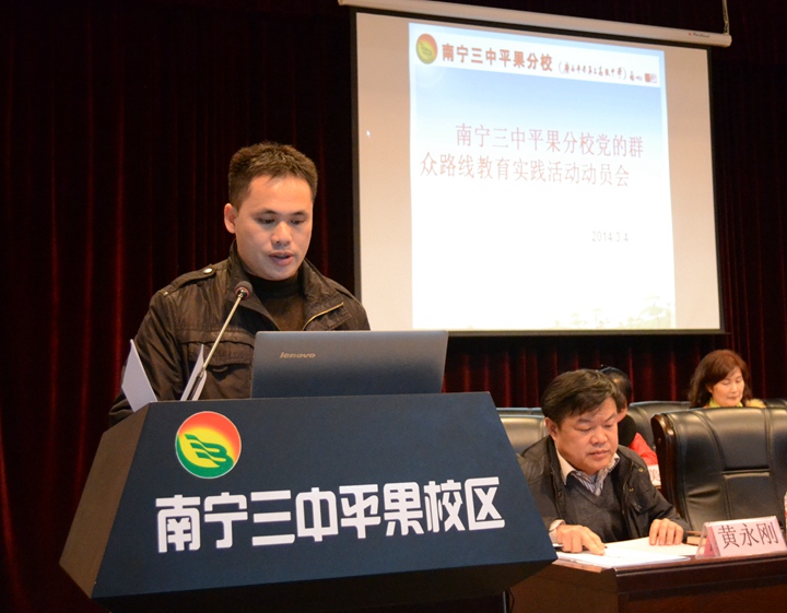 2014年3月4日下午,我校全体教职工在学校报告厅隆重召开深入开展党的群众路线教育实践活动动员大会。督导组组长:县妇联主席黄红艳,副组长:县环局副局长、党组成员、纪检组长黄永刚,组员:平果工业区管委会副主任黄丹美,县人口和计划生育局党组成员、纪检组长黄启西,县委组织部干部二科科长唐慧娇,县教育局副主任科员余兆云等领导莅临大会指导。