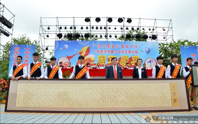 据了解,南宁三中平果分校于2005年创办至今,为百色市高考做出了重要贡献,连续6年荣获百色市高考质量一等奖和突出贡献奖。将来,学校将继续坚持“文化立校、特色兴校、质量强校”的办学思想,以爱为笔,以智慧为墨,书写平果分校的新篇章!