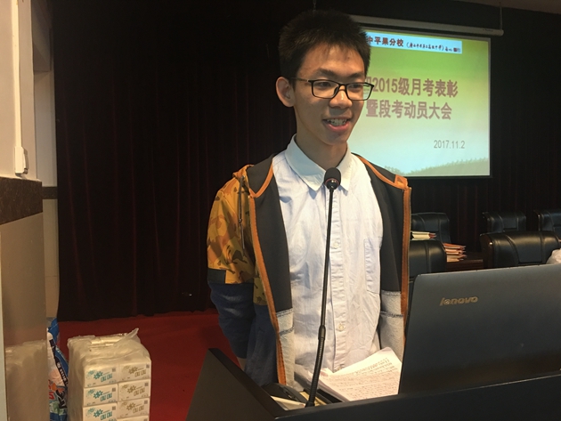 为了激发同学们的争先创优意识,鼓励大家积极投入到段考备考中,11月29日晚,初2015级全体师生在学校报告厅召开本学期第二次月考表彰暨段考动员大会。杨敏校长、阮国辉主任出席了此次会议。会议由陆玲宇同学主持。