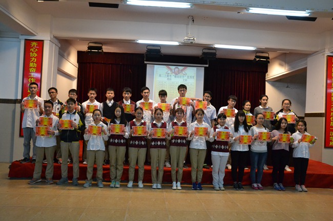 大会议程的第一项,进行表彰。由高二(3)班的农晓芸同学宣布获得高二上学期期考成绩优秀的孙宇东、农世霖、农晓芸、甘甜等28名同学名单,由年级颁发奖状和奖品。接着由高二(4)班卢丽雯同学宣读获得上学期期考成绩进步奖的余燕妮、农玉、郑斯宇等31名同学名单,年级颁发了奖状和奖品。年级此次还设立了一个特别奖,奖励了在每次考试中均独占鳌头的高二(1)班的孙宇东同学,年级领导陈可发老师为他颁发了奖品。最后,表彰的是为年级管理做出贡献的“年级自主管理委员会的同学们,感谢他们为年级的纪律管理所做的工作。