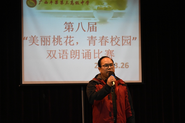 为了培养我校高一年级同学的双语朗读能力,增强学生对诗歌的热爱,丰富学生们对于语言文化的理解。3月26日晚,我校在报告厅举办了第八届桃花节高2018级双语朗诵比赛。校领导黄尚泽董事长、杨敏校长、高文广常务副校长、黄春彬副校长、杨琦副校长、黄伟副校长到场观看了比赛。同时还有语文组、英语组的吕安娜、黄小芳等老师,到场为参赛的班级打分。