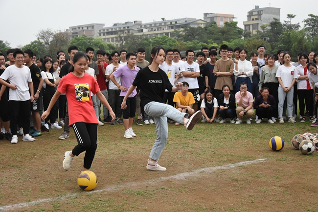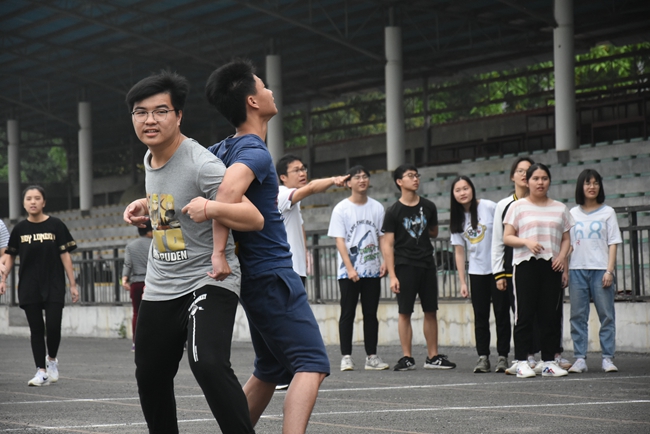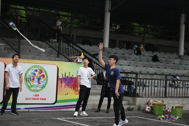 活动分为五项内容,分别是抛接绣球、“心心相印”、“圈地站人”、“临门一脚”以及学生代表与家长代表的拔河比赛。活动由年级组长黄宗祧老师主持。在评委老师宣布完相关活动规则后,素质拓展活动开始。首先举行的是抛绣球比赛,每班16个同学或家长组成的抛接绣球队进行比赛,这个项目考验了抛绣球的同学和接球的同学的默契程度。第二个项目是“心心相印”——齐心协力运送气排球比赛。同学们通过接力的方式,在规定时间内运送气排球,数量多的班级获胜。在接下来的比赛项目中,同学们为了班级荣誉而战,参与热情高涨,乐在其中。
