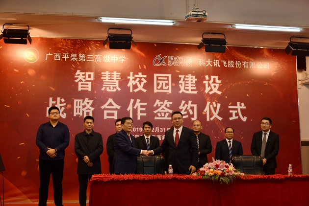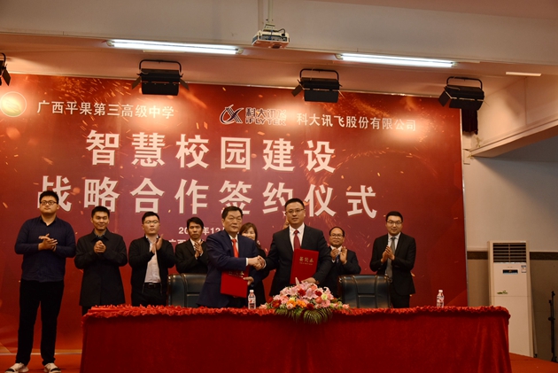 最后,我校黄尚泽董事长和科大讯飞广西大区副总经理王欣先生签订合作协议并合影留念。