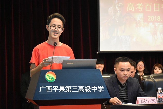 大会议程的第四项,由家长代表庞学东先生发言。庞先生首先感谢学校和老师们对孩子们的培育。在这一场高考的大战中,家长永远是孩子们最坚定的支持者,家长永远爱我们的孩子,只希望孩子们在面对高考的时候,能竭尽全力,无愧于学校老师和家长,无悔于自己的青春岁月。最后,庞先生祝愿所有的同学在高考中金榜题名,祝平果三中在高考中再创辉煌。