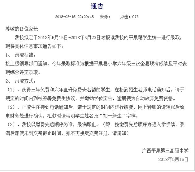 我校2018级初一新生招生工作在大家的大力支持之下,已超额完成招生任务。现根据我校5月16日官网发出的《通告》第2点第(3)条,特公告如下,请大家相互告知: