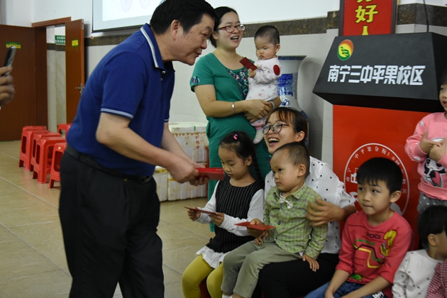 为了促进教职工子女健康成长,培养和增强儿童的家庭观、亲情感,增强儿童节活泼欢快的节日气氛和体现学校对教职工子女的人文关怀。我校于5月30日下午,在学校报告厅组织开展了教职工子女庆“六一”儿童节活动。小朋友们在父母的陪同下,在报告厅内嬉戏玩闹,一阵阵欢声笑语,热闹非凡。黄尚泽董事长和杨敏校长为孩子们送上了节日的祝福,祝孩子们在平果三中的大家庭里快快乐乐地成长!永远健康幸福!两位领导还为孩子们发放了节日慰问金和节日礼物,送去了浓浓的节日祝福。
