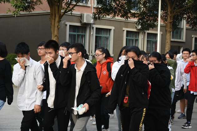 随着一声“着火啦……”消防疏散开始了,位于学校教学楼主要消防通道的楼道里烟雾缭绕,消防警报骤然响起。演练的学生在疏导老师的指挥下,采用捂住口鼻,弯腰低姿等方式,有序的从教学楼由一层到五层的顺序快速疏散,在操场指定的位置集合,各年级清点人数,汇报疏散情况,医护组做好了急救准备;宿舍楼各楼梯口、安全出口、转弯处均安排了人员指引疏散路线,整个疏散过程自始至终井然有序。