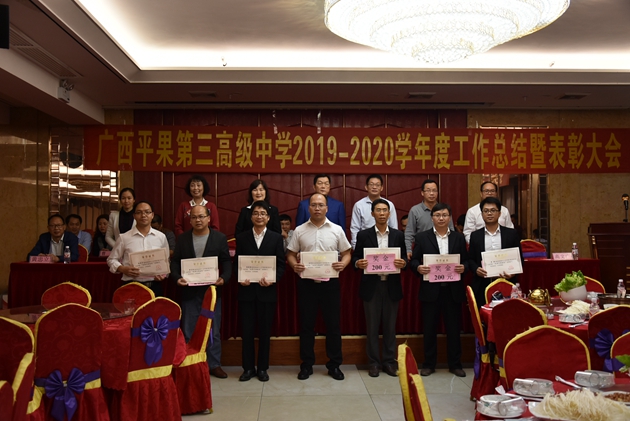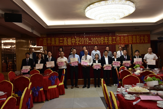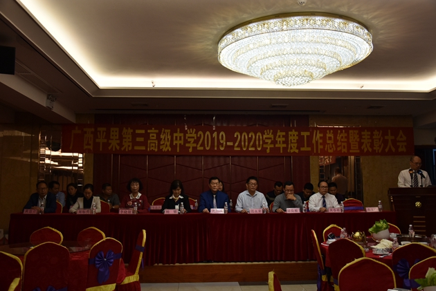 大会议程的第三项,由黄尚泽董事长讲话。黄董事长首先向一直关心、支持、帮助我校发展的县委、县政府、县教育局、兄弟单位和社会各界友人表示衷心地感谢!向在师德师风建设中表现突出,在教书育人、为人师表、家校共育的工作中成绩显著而受到表彰各位领导、老师、员工们表示祝贺!接着黄尚泽董事长就2019——2020学年度的工作做了总结。一是科研工作成绩显著。本年度积极开展课题研究、赛课等活动,取得丰硕成果。二是年级管理工作从紧从严从实,确保良好的学习氛围,教学效率明显提高。三是班主任工作扎实高效。四是拓宽学生全面发展空间,学生处、团委组织开展丰富多彩的活动,最大限度地拓宽了学生的发展空间,丰富了学生的生命历程。五是清、北学生培养稳步开展,效果明显。连续三年产生清、北学生。今年会加大培养工作,力争出现更好地成绩。六是安全保卫措施落实防控到位。确立各种安全管理制度,确保了学校师生的生命财产安全。七是落实食品安全责任制度,预防食品安全事故发生。最后,董事长指出,在新的学年里,全体教职员工要砥砺前行,不懈奋斗,为平果三中的高质量发展做出新的、更大的贡献!
