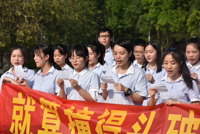随着国歌的响起,各班同学起立,满怀激情地高唱国歌。接着进行的是大会的第二项,高三各班依次宣誓。学生们把自己的决心和信心化成了一句句誓言,在激昂的宣誓中,再一次坚定了为高考奋力拼搏的决心和高考必胜的信心!