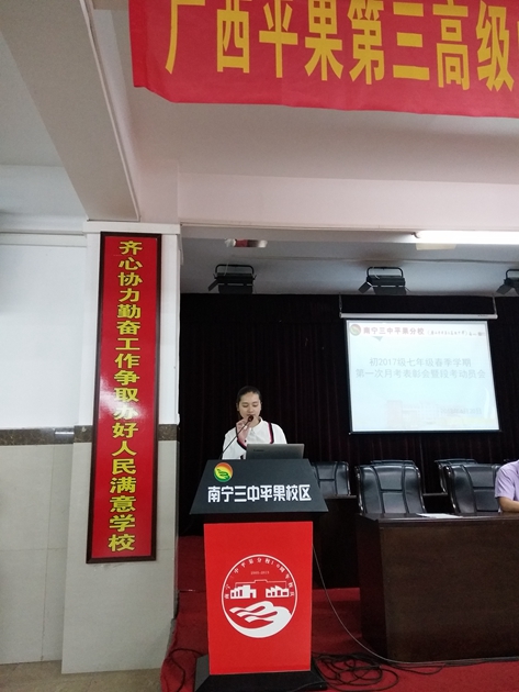 4月20日晚,初2017级全体师生在学校报告厅召开初一下学期第一次月考总结表彰暨段考动员大会。