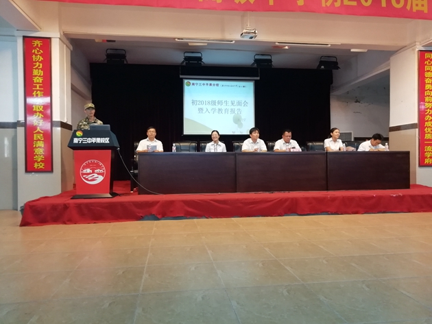 2018年8月27日上午,我校为初2018级新生举办了教师见面会。出席本次见面会的领导有:宿舍纪律管理处主任兼校长助理潘忠峻老师、科研处主任阮国辉老师、教务处副主任彭玲玲老师、团委副书记黄海慧老师、年级副组长陈炎锋老师、年级副组长周扬老师、黄埔青少年军校教官及初2018级全体班主任和学生。大会由年级组长李贤伟老师主持。