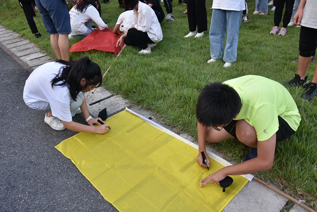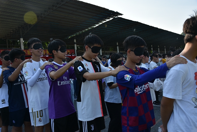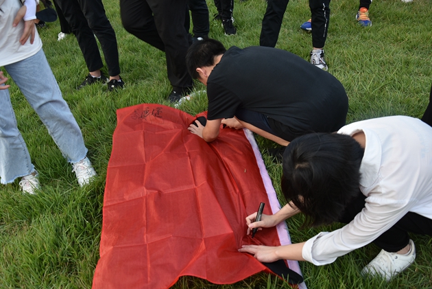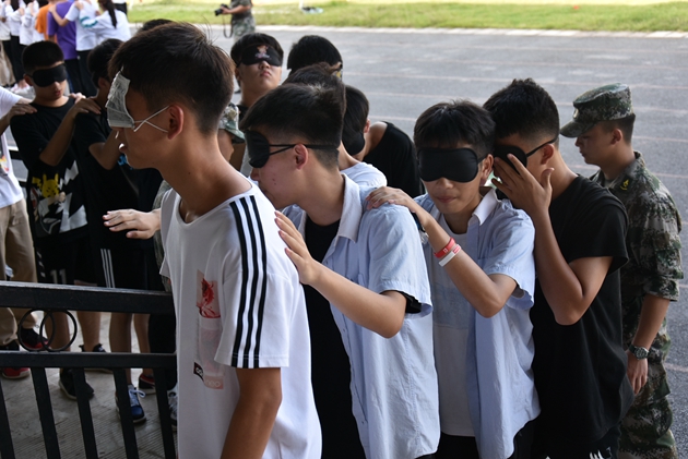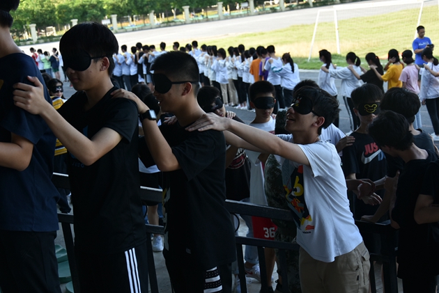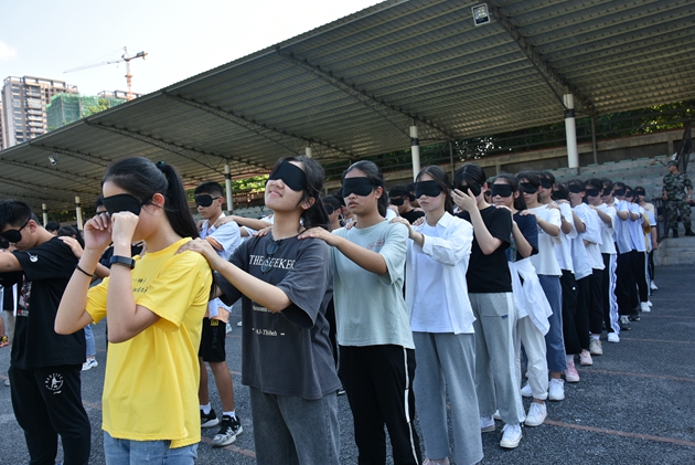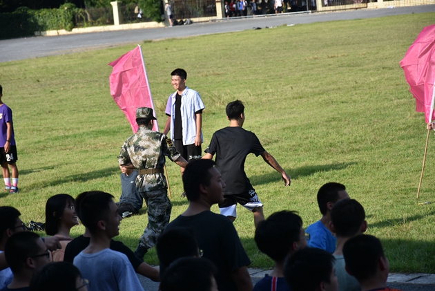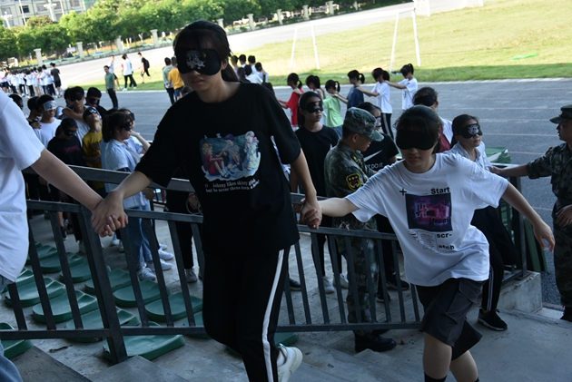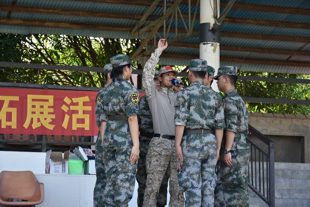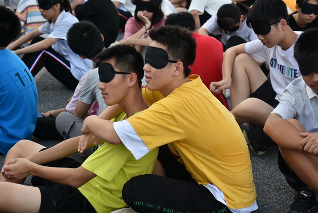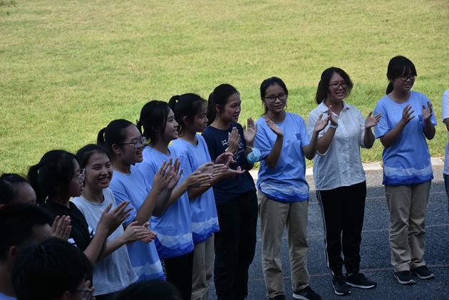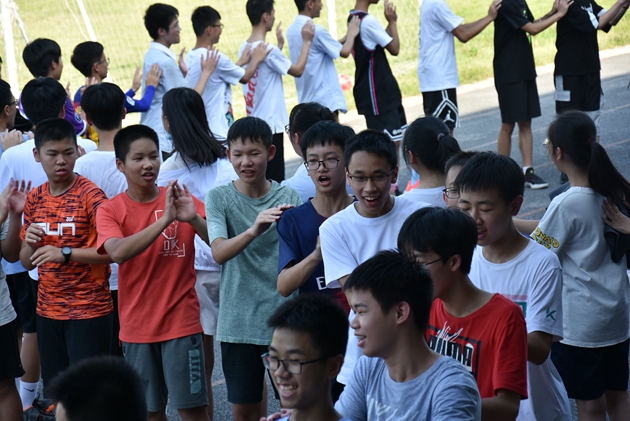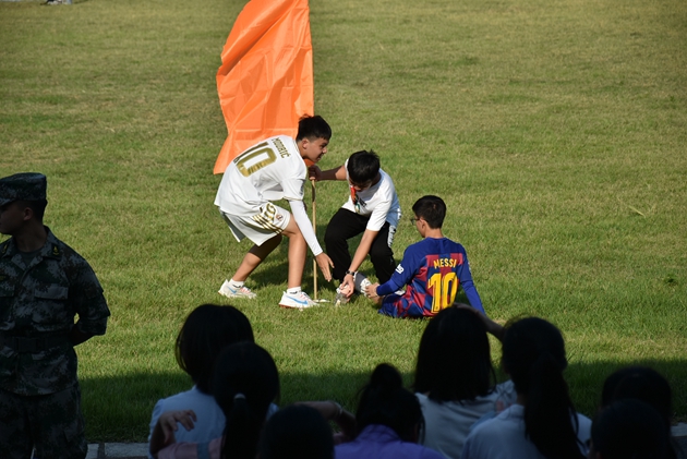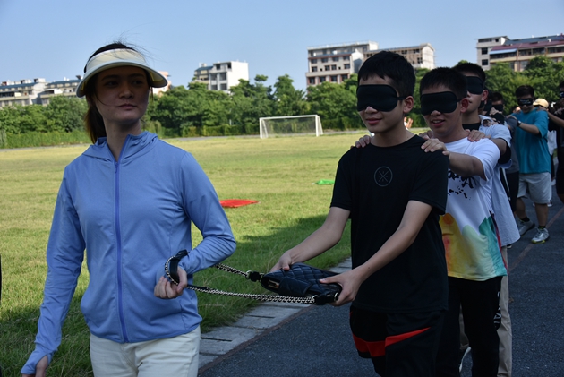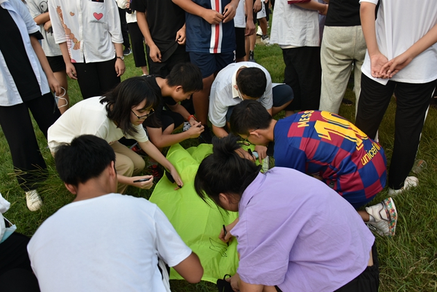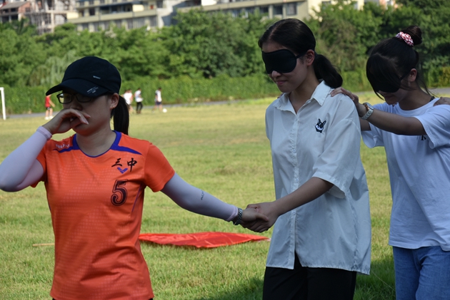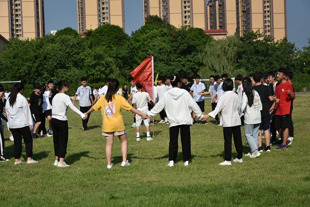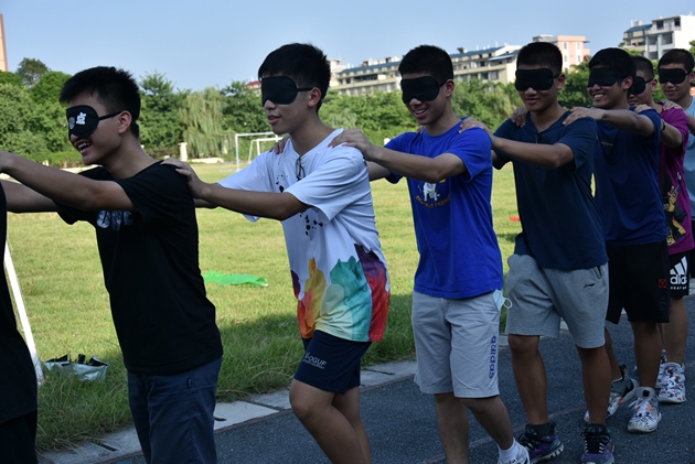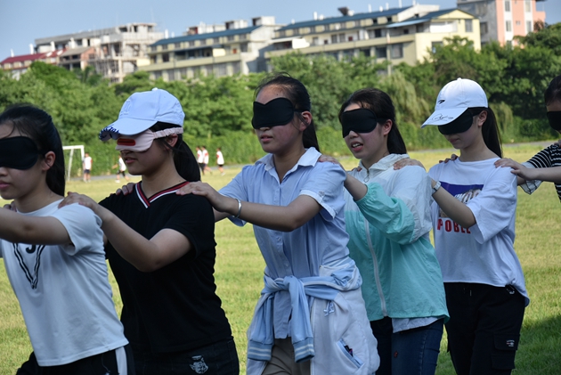 活动分为三项内容,分别是“欢乐节拍”、“前线支援”、“人生风雨路”。在教官宣布完相关活动规则后,素质拓展活动正式开始。首先举行的是“欢乐节拍”,以班级为单位围成大圈,在拍背和拍手的动作下一齐喊口号,这个项目考验了全班同学的默契程度。第二个项目是“前线支援”,在教官的要求下,同学们要将前线最需要的物资运达前线。这个项目考查的是同学们的反应速度,在规定时间内运送的物资数量最多的班级获胜。最后的项目是“人生风雨路”,全体同学在蒙上眼罩的前提下,在老师们教官的帮助下,跨过一个个障碍物,大家齐心协办地走向终点。在整个拓展活动中同学们参与热情高涨,乐在其中。