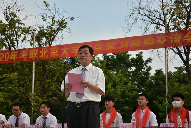 今天,学校在这里举行在2020年高考中,考取北京大学3位学生学习经验交流会暨奖学金颁奖仪式、初一年级入学教育以及军训活动。在这里,我谨代表学校领导,祝贺余东侠、黄宗宇、秦谦信被北京大学录取,实现人生价值追求。今天你们以三中为荣,明天三中以你们为荣。