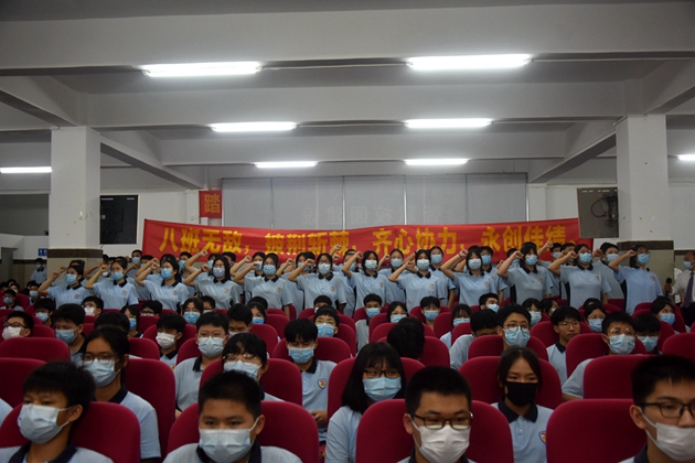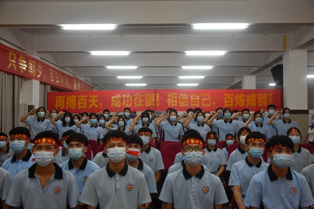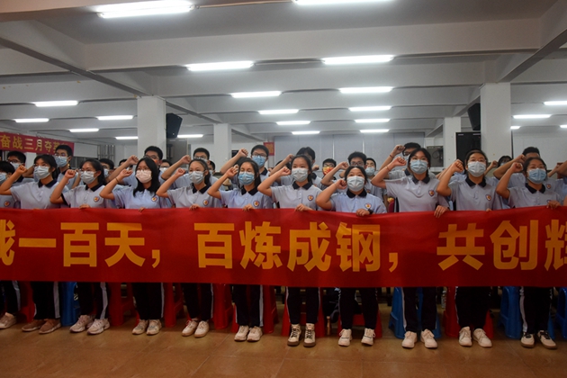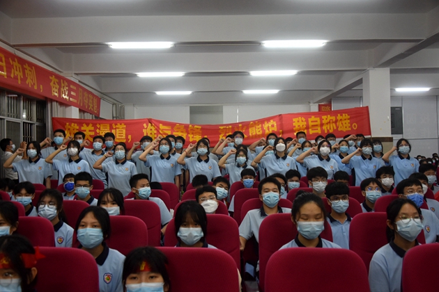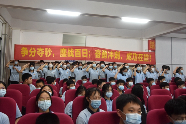2022年3月17日19时30分,我校在报告厅隆重举行了以“奋战百日,誓创辉煌”为主题的初2022届决战中考百日冲刺誓师大会。学校黄尚泽董事长、杨敏校长、高文广常务副校长、黄春彬副校长、杨琦副校长、黄伟副校长、学校中层以上领导、家长代表唐秀山先生以及初三全体师生参加了本次大会。由黄春彬副校长主持。⼤会正式开始,全体师生奏唱国歌、校歌。冉冉升起的国旗预⽰着平果三中的新学期充满了⽣机、2022年中考充满了希望。