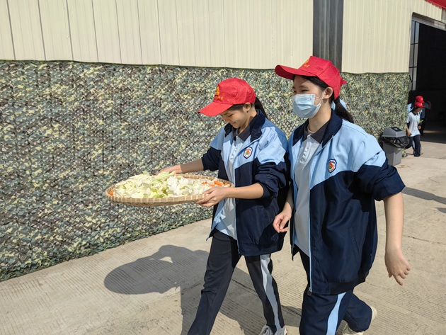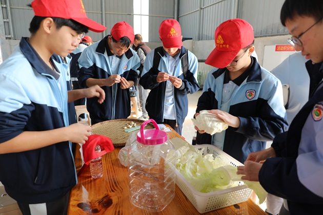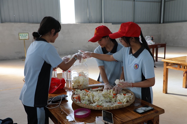 泡菜不仅仅是一种食物,更是承载着人类智慧和文化传承的载体。在冶文军老师的指导中,同学们戴好手套,跟随老师的步骤指导,认真细致的完成洗菜、切菜、晾晒的步骤,将蔬菜放入泡菜坛,赋予这小小泡菜极高的仪式感。