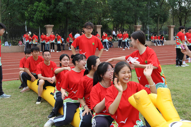 “旱地龙舟”赛场上,充气龙舟化身“战船”,10名队员齐力托举,迈着整齐又滑稽的步伐冲向终点。各班男生女生配合无间,以“飞龙”之势勇往无前。